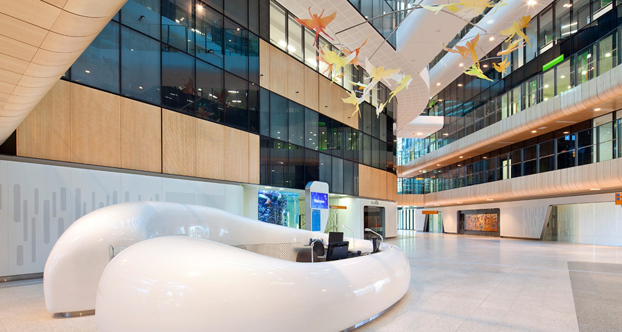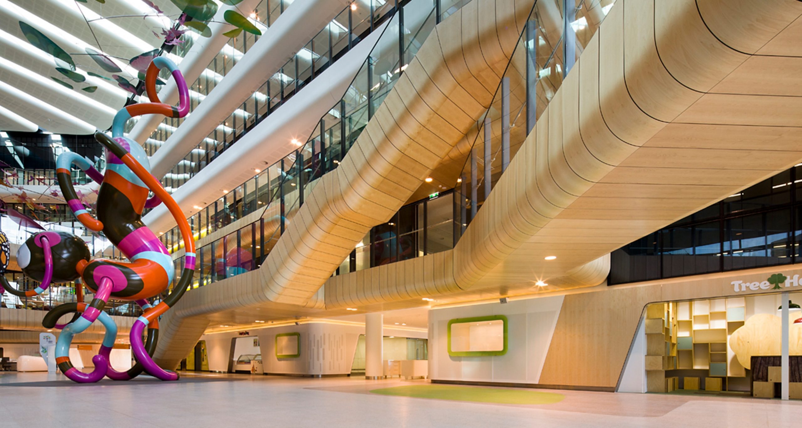 Những tấm che nắng đầy màu sắc ở bên ngoài tòa nhà mang lại cho bệnh viện một diện mạo thân thiện. Những tác phẩm điêu khắc quy mô lớn, kỳ quái; bể cá rạn san hô hai tầng; rạp chiếu phim và sân chơi ngoài trời an toàn là một trong những tính năng được thiết kế để làm hài lòng và đánh lạc hướng các bệnh nhi.