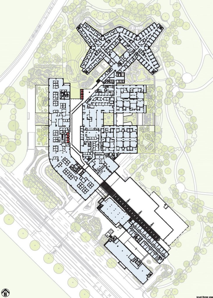 Các phòng khám chuyên khoa được bố trí chung ở tầng trệt để cung cấp dịch vụ chăm sóc thuận tiện và chất lượng. Các khu vực chờ linh hoạt cho phép các gia đình vào bể cá, cửa hàng bán lẻ và thực phẩm, vườn và khu vui chơi trong khi chờ khám.