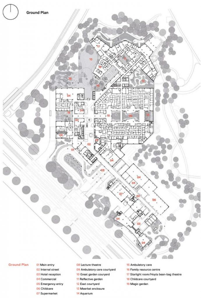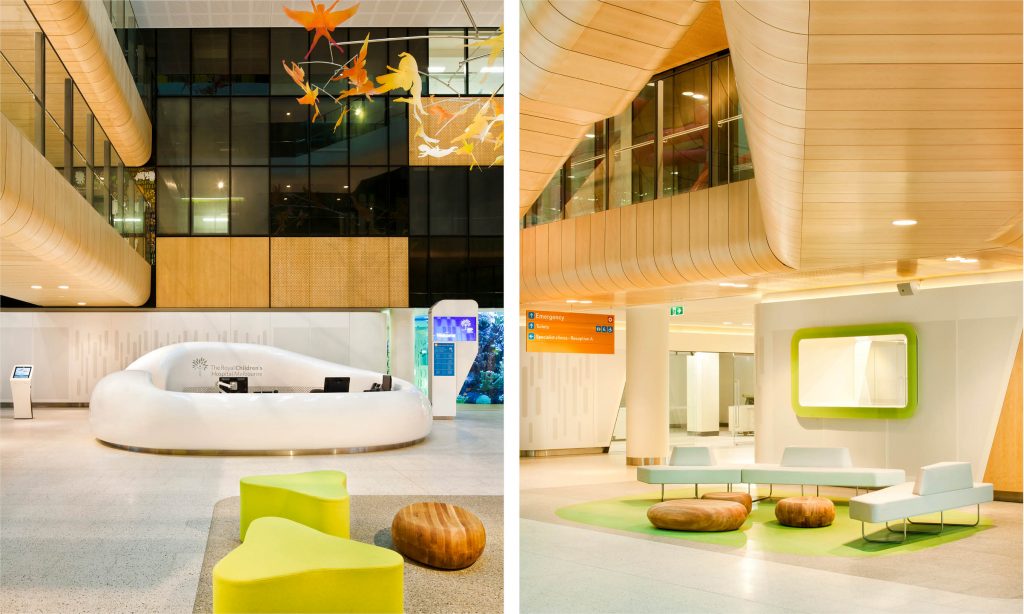 Bệnh viện Nhi đồng Hoàng gia của Melbourne thiết kế theo hướng tạo ra một môi trường điều trị và ngơi nghỉ, thư giãn cho mỗi bệnh nhi. Bằng cách tạo cho trẻ em một môi trường yêu thích, bệnh viện sẽ không còn là nỗi khiếp sợ của các em, tạo điều kiện thuận lợi cho quá trình chữa bệnh. Bệnh viện được thiết kế để trở thành một cơ sở đẳng cấp thế giới, cung cấp dịch vụ chăm sóc chất lượng mới nhất trong môi trường chữa bệnh đáp ứng nhu cầu của trẻ em, gia đình và nhân viên của họ với thiết kế khu vực cho trẻ em bao gồm sân chơi tương tác, bể cá san hô hai tầng, một kỳ quan khoa học của triển lãm khoa học, rạp hát…