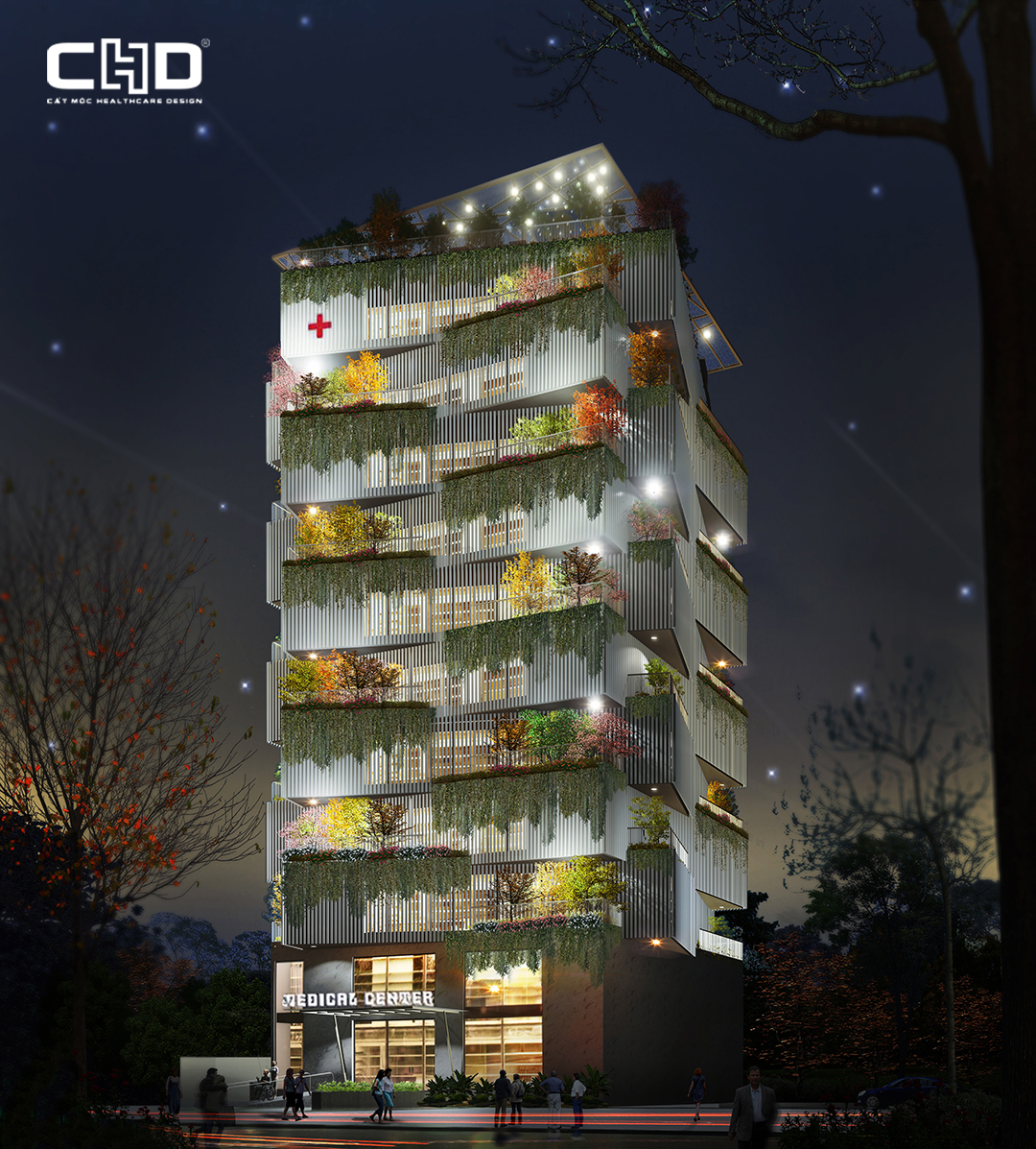 Bệnh viện với quy mô 12 tầng, sỡ hữu hình thức phân khu chức năng dưới dạng hợp khối do quy mô khu đất xây dựng nhỏ, công trình sử dụng chất liệu bằng lam nhôm, tường kính với các khối hình học đan xen với nhau, khối mảng đặc rỗng kết hợp cùng các mảng xanh tạo nên một hình khối hài hòa theo một tỉ lệ và mô-đun nhất định, giữ được sự tinh tế, thẩm mỹ cho công trình.