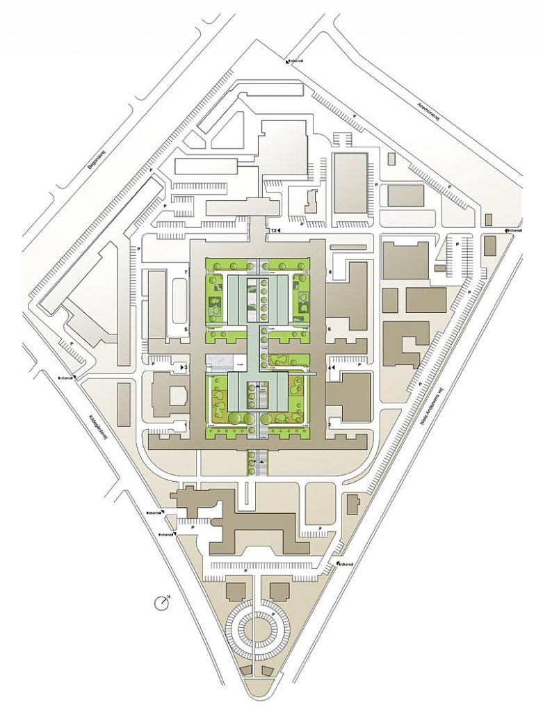 Ở các tầng cao nhất, khu vực mới sẽ chứa các phòng trang bị nhiều thiết bị như 24 phòng mổ mới, trong khi ở các tầng tương đương, các tòa nhà cũ sẽ được sử dụng làm khu phòng nội trú. Bố trí này, với các phòng nội trú được đặt theo mẫu hình bát quái xung quanh các phòng điều trị, sẽ giảm thiểu nhu cầu vận chuyển hàng ngày, có lợi cho cả bệnh nhân và nhân viên y tế.